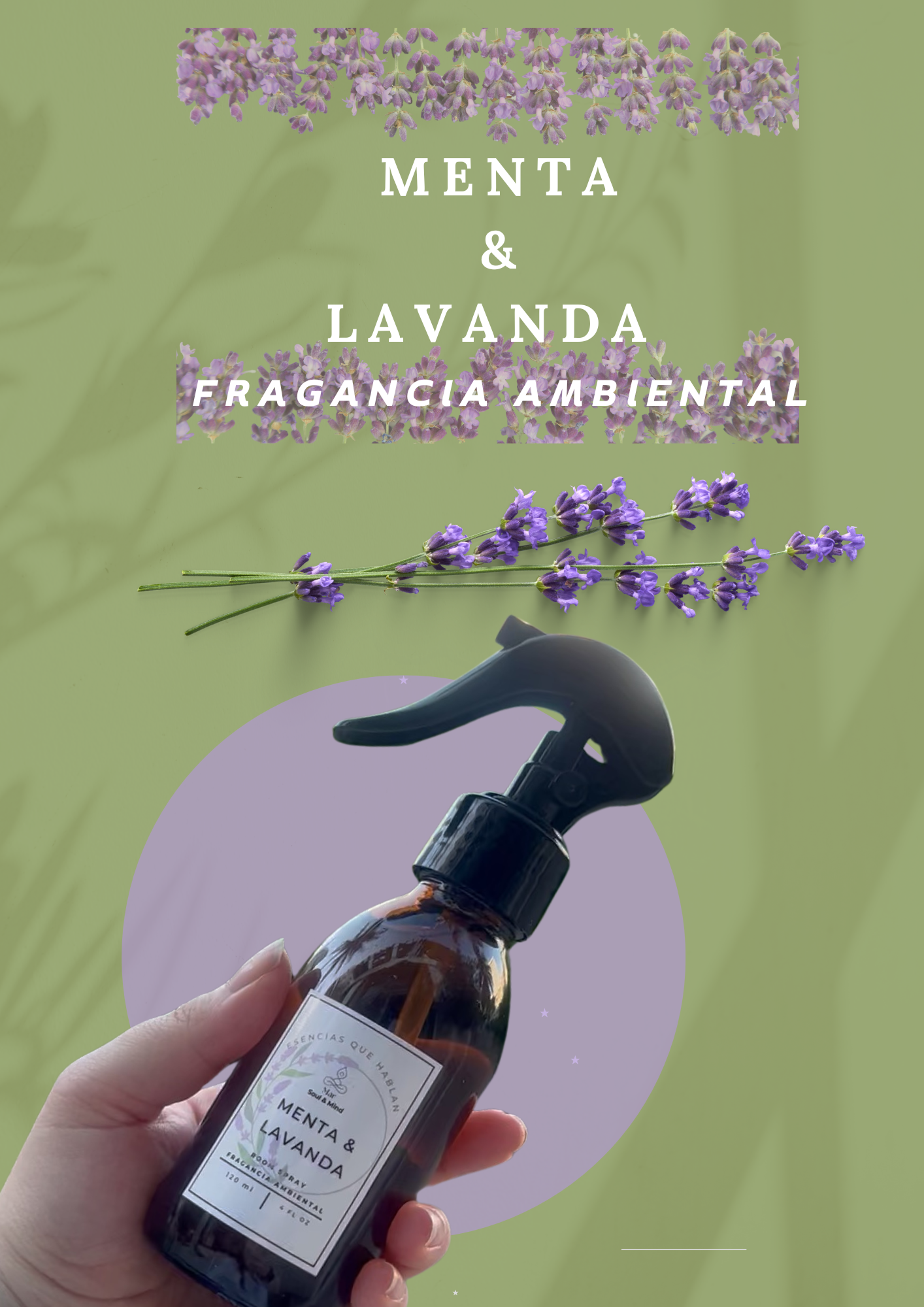 Aceites esenciales puros de menta y lavanda, sin químicos sintéticos, conservantes ni fragancias artificiales. Solo lo mejor de la naturaleza.